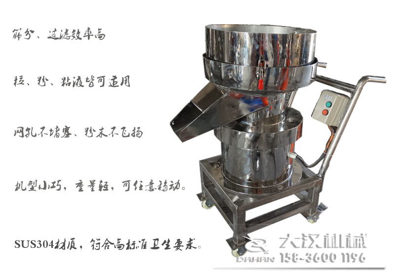 過濾篩是一種適用于各行業單層,小顆粒、粉、粘液處理生產量小或者雜質少物料的振動篩分、過濾設備。大漢牌推車式450型過濾篩,在原有過濾篩的基礎上,配備了小推車,推車與機身融為一體,使本身機型小巧的450過濾篩移動起來更加的方便,省時省力。
