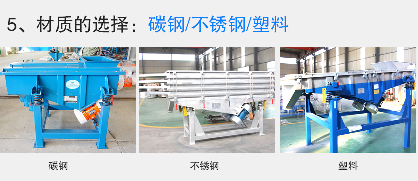 如果用戶篩分的物料是運用到醫藥、化工、食品等行業,可以優先選擇304不銹鋼材質的振動篩,如果篩分物料是運用到化工行業中,且具有酸堿性、腐蝕性的話,一定要避免選用一些不銹鋼等金屬材質的振動篩,必須選擇機身材質為聚丙烯PP材料的振動篩。